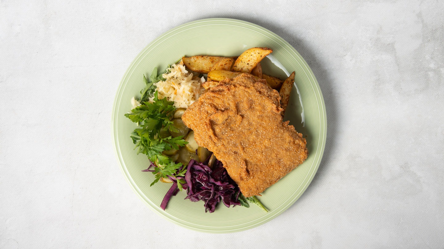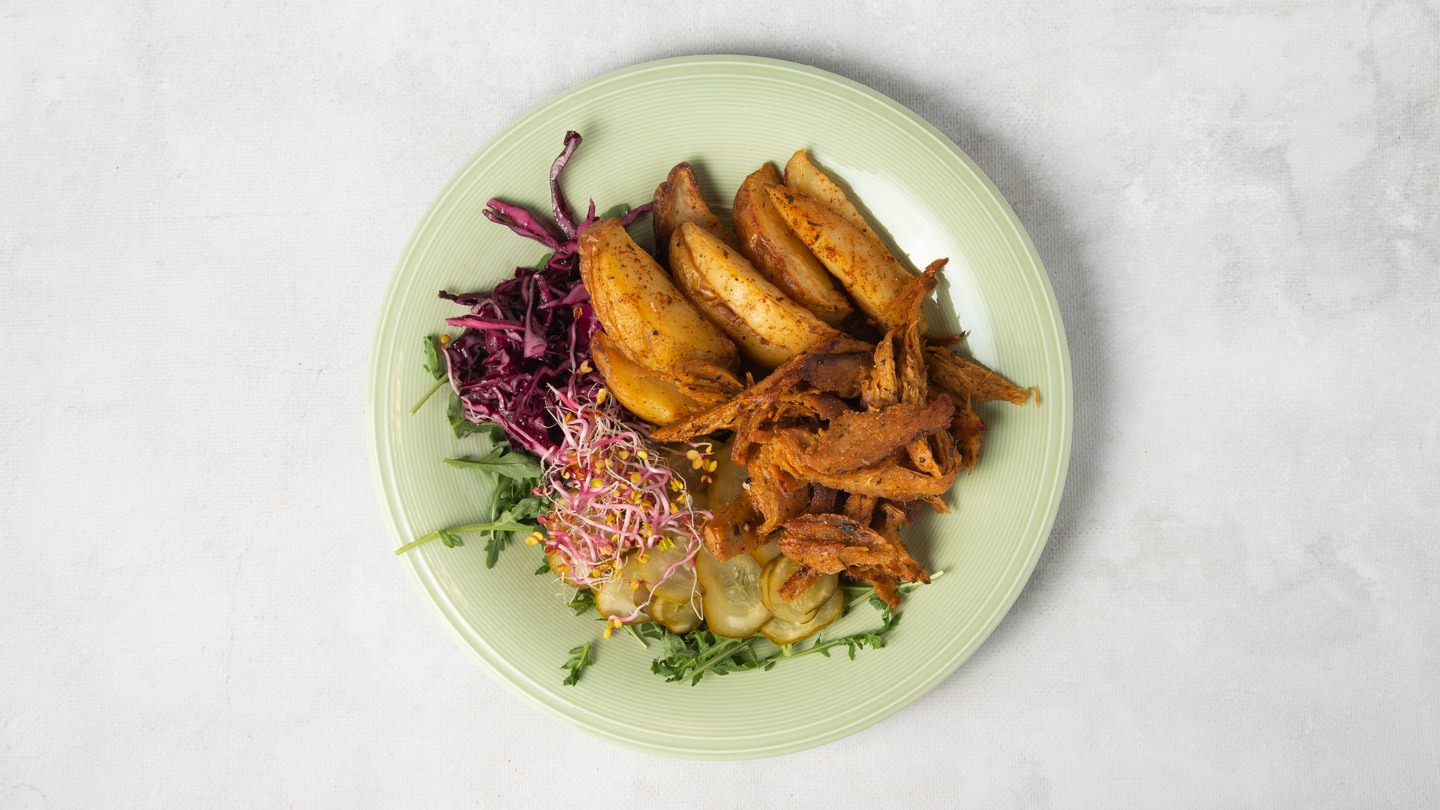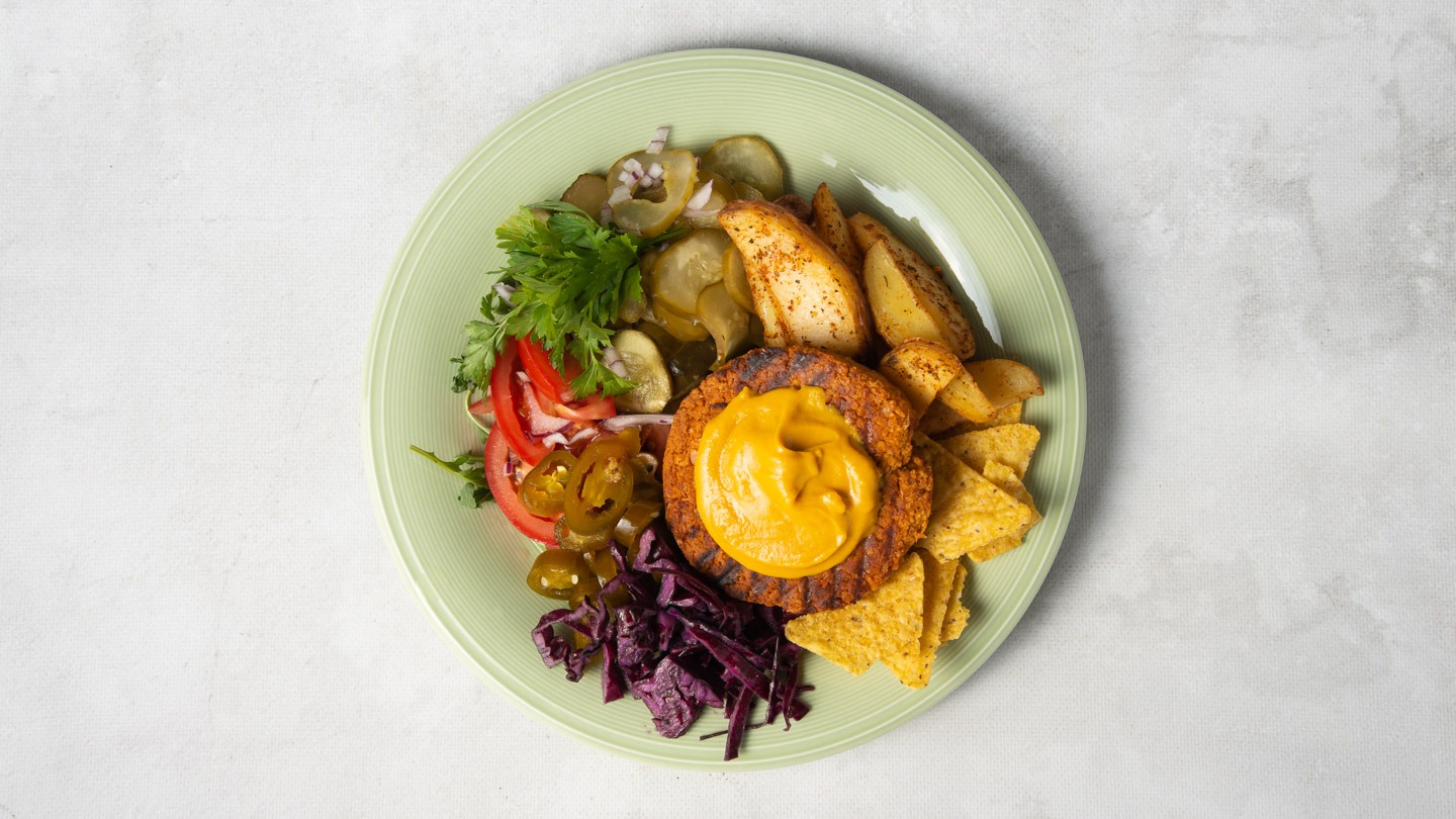 Danie obiadowe - wybierz swój ulubiony kotlet roślinny naszej produkcji z pieczonymi ziemniakami i dodatkami.