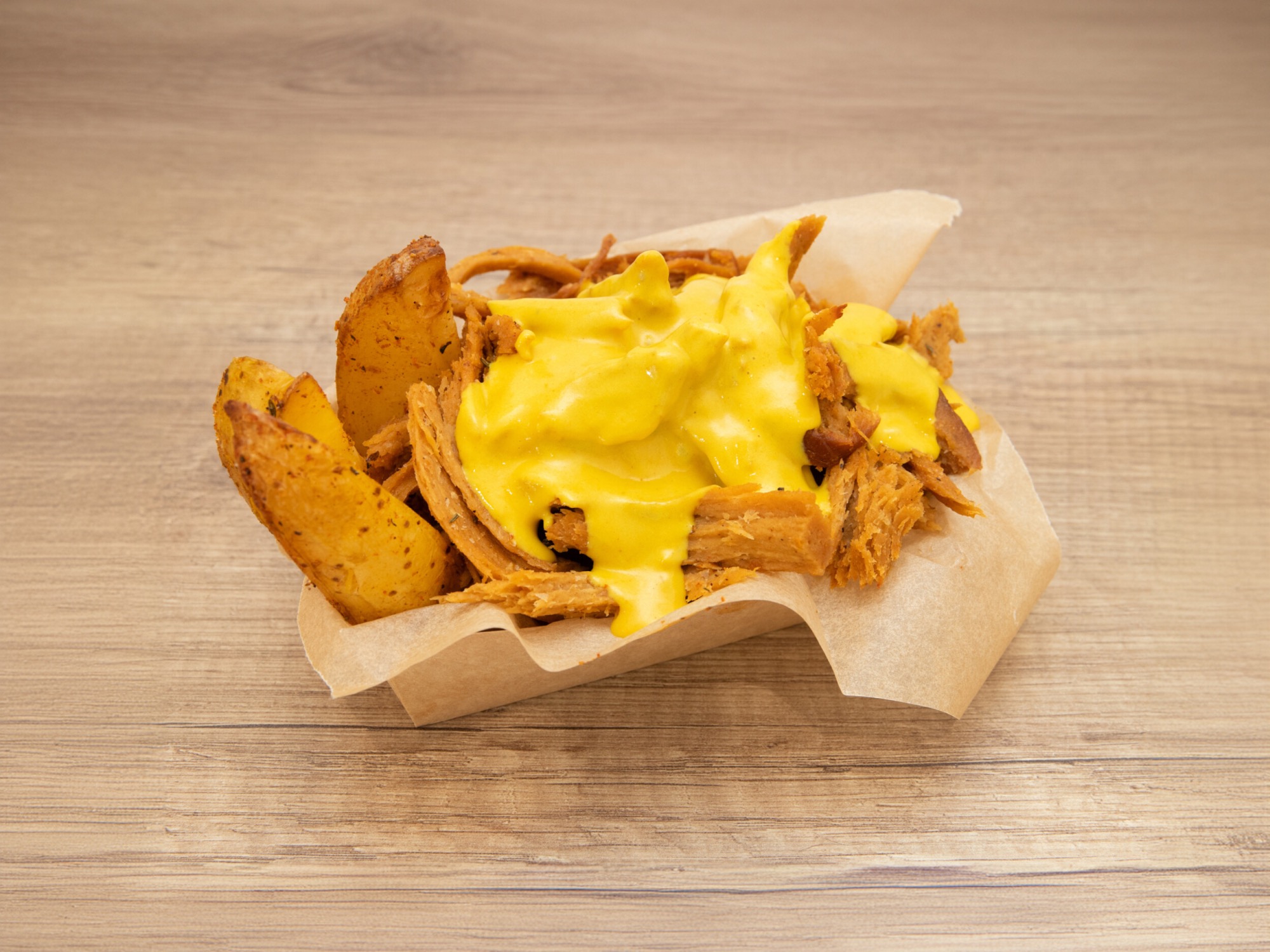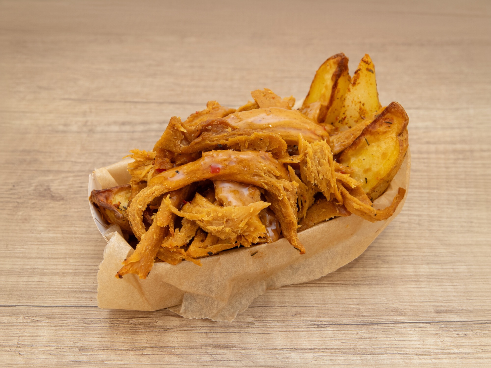 Pieczone ziemniaki z szarpanym seitanem w towarzystwie jednego z naszych 6 sosów.